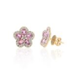 Weighing 3.871 grams, these pink sapphire cherry blossom flower earrings offer a lightweight yet luxurious feel, making them ideal for everyday wear or special occasions. The elegant design ensures that the pink sapphires and diamonds remain the focal points, allowing their beauty to shine through. The sophisticated cluster setting provides a secure and stylish way to showcase the gemstones, enhancing the overall appeal of the earrings.