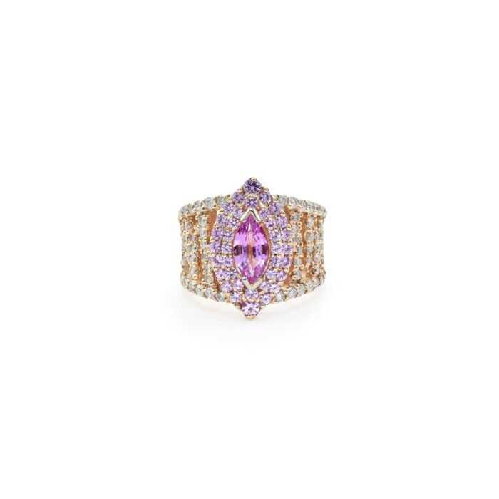 This 14K Solid Gold Pink Sapphire Ring is a breath-taking beauty of elegance and a touch of color. Featuring an extraordinary 1.25-carat pink sapphire, the ring is adorned by sparkling diamonds weighing in total 1.35 carats.