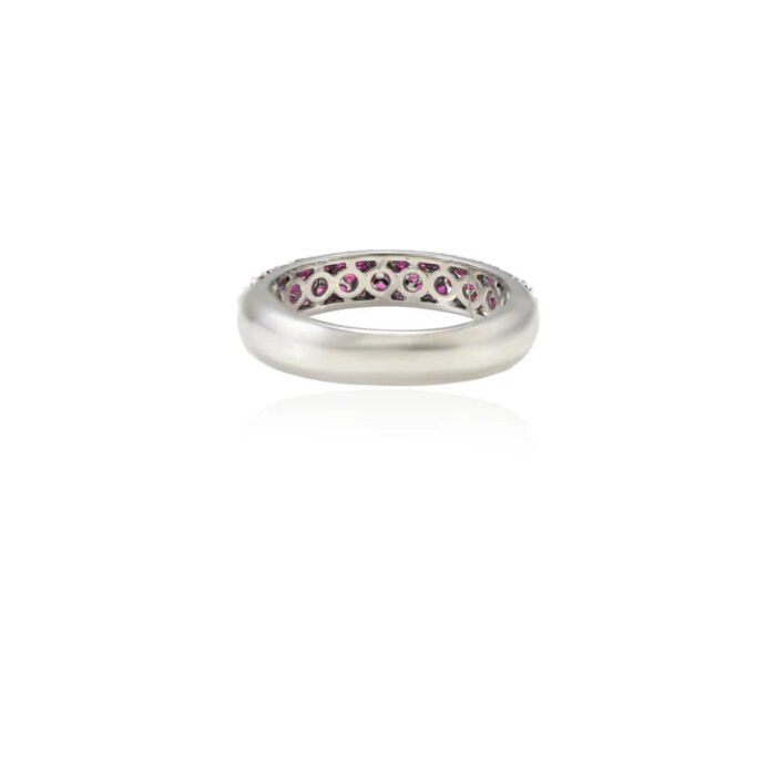 The pave setting enhances the natural brilliance of the rubies, allowing their vivid color to shine through and creating a captivating sparkle. The dome style design adds a touch of sophistication and uniqueness, making this band a standout piece in any jewelry collection.