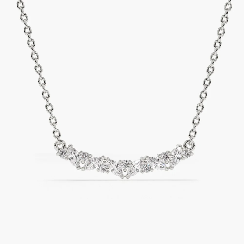 The 14K Gold Slanted Marquise and Round Natural Diamond Necklace features six marquise-cut and seven round diamonds (0.28 ct) in an elegant, modern design. BIS Hallmarked, available in white, rose, and yellow gold.
