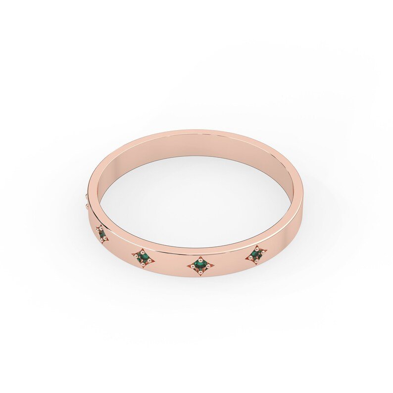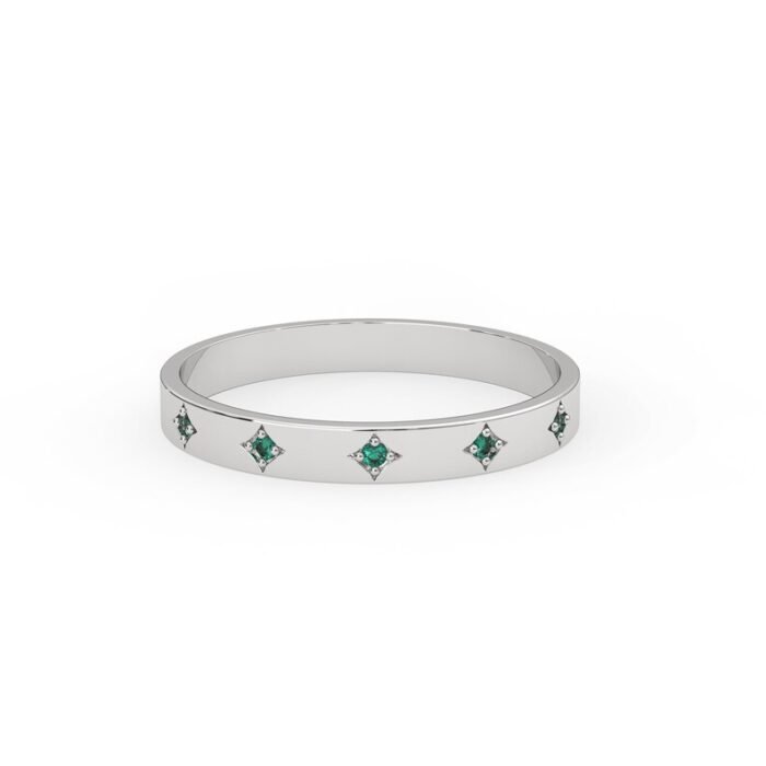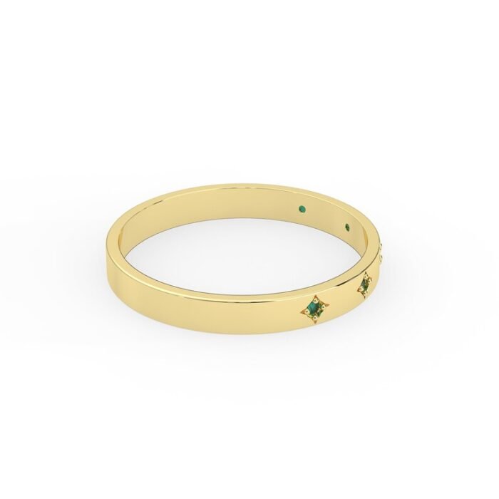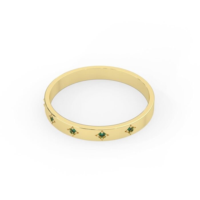 A stunning 14K solid gold eternity band featuring alternating emeralds and diamonds, offering a timeless and elegant design symbolizing eternal love.