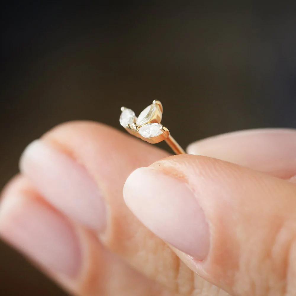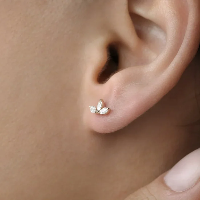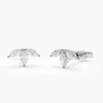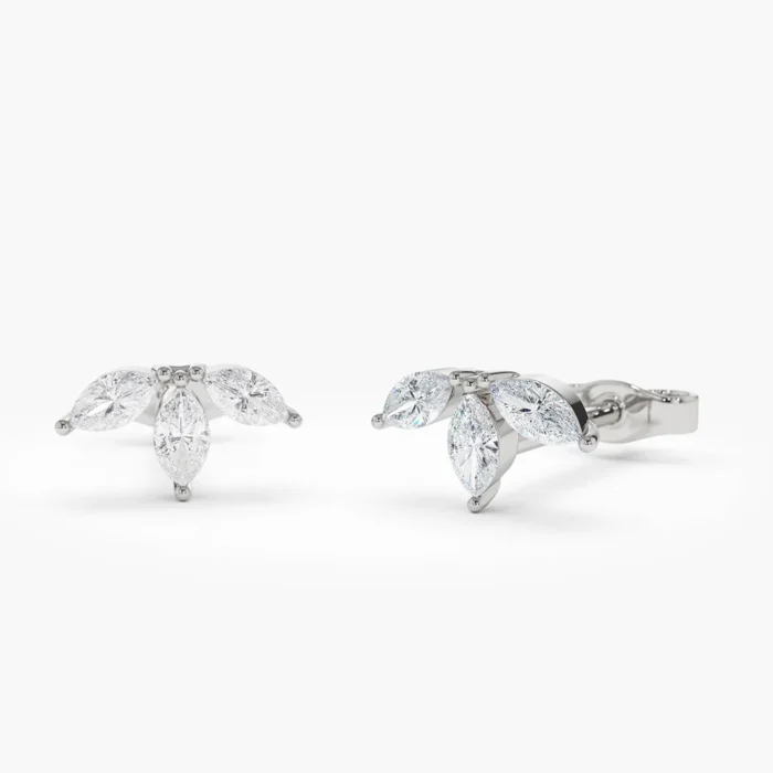 The 14K Marquise Natural Diamond Crown Stud Earrings showcase 0.38ct of G color, VS clarity marquise diamonds, with four diamonds measuring 3.75 x 2 mm and two diamonds measuring 4 x 2 mm. These earrings are crafted from solid 14K gold, available in white, rose, or yellow gold.