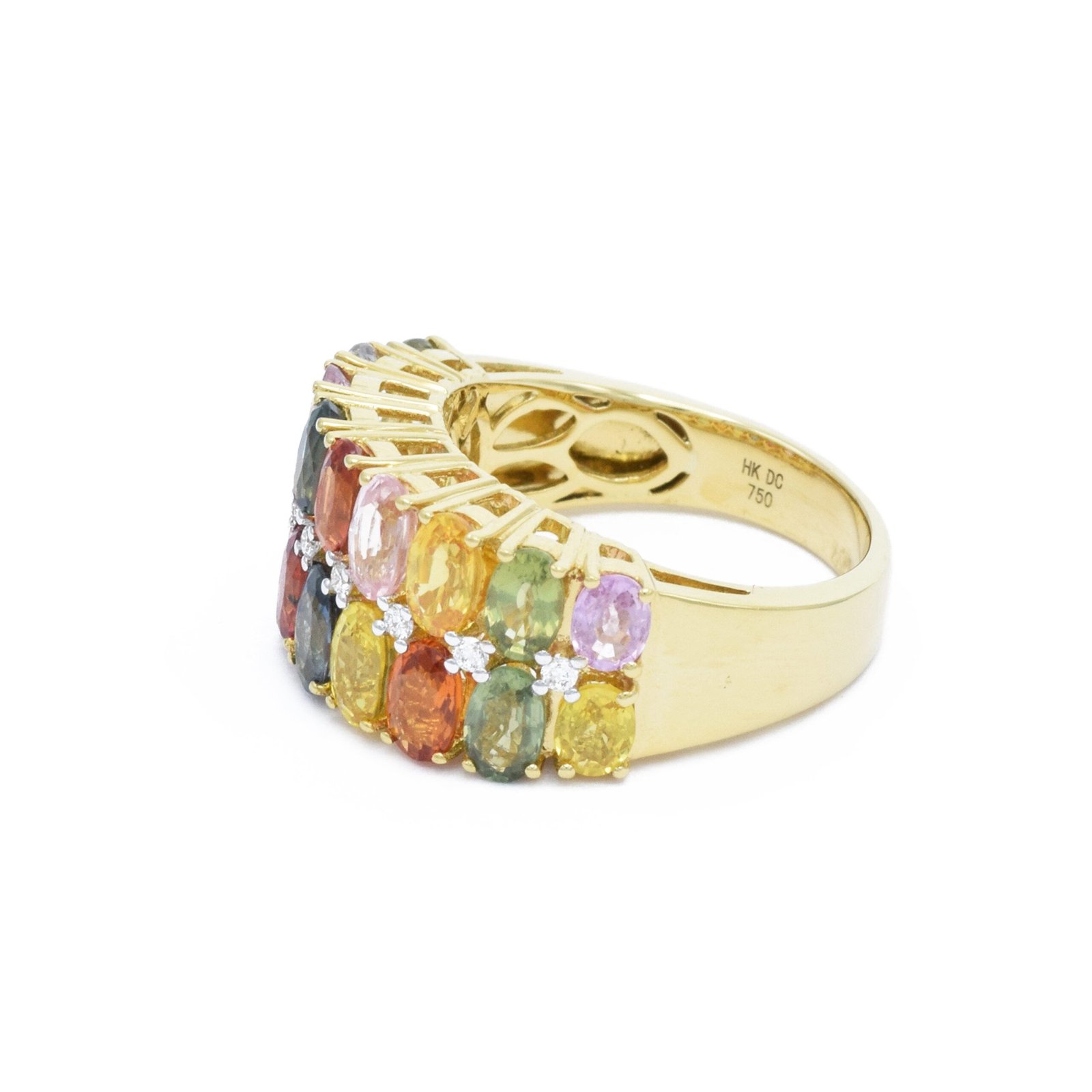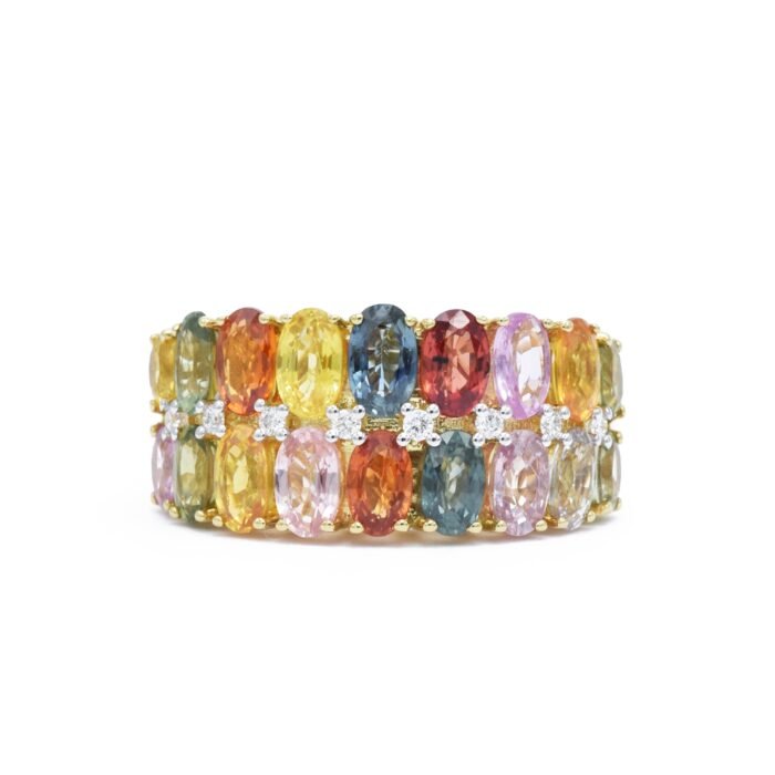 Vibrant 14K solid gold ring featuring two rows of multi-color sapphires—crafted for bold elegance, playful charm, and timeless sophistication.