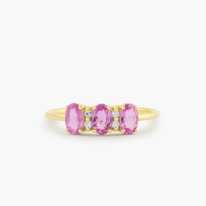 At the center of this impressive piece is a 5×3 mm oval-cut authentic pink sapphire that radiates its very enchanting coloration, meaning love and love. Surrounding the sapphire are sparkling round diamonds, every one measuring 1.20 mm; these add to the overall brilliance of the ring. With the total carat weight of the diamond being 0.05 ctw, this diamond adds an elegance without bringing out the sapphire at the center.