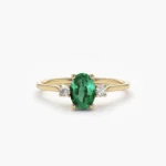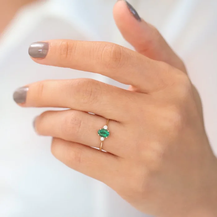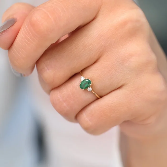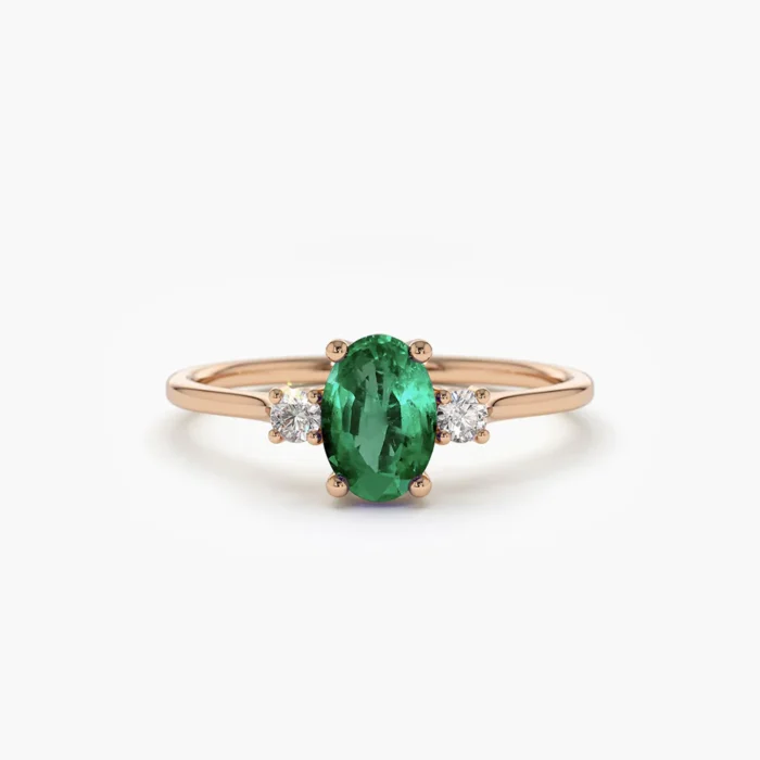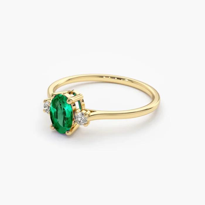 Timeless 14K solid gold ring featuring an oval emerald flanked by two diamonds—crafted for classic elegance, vibrant color, and lasting beauty.
