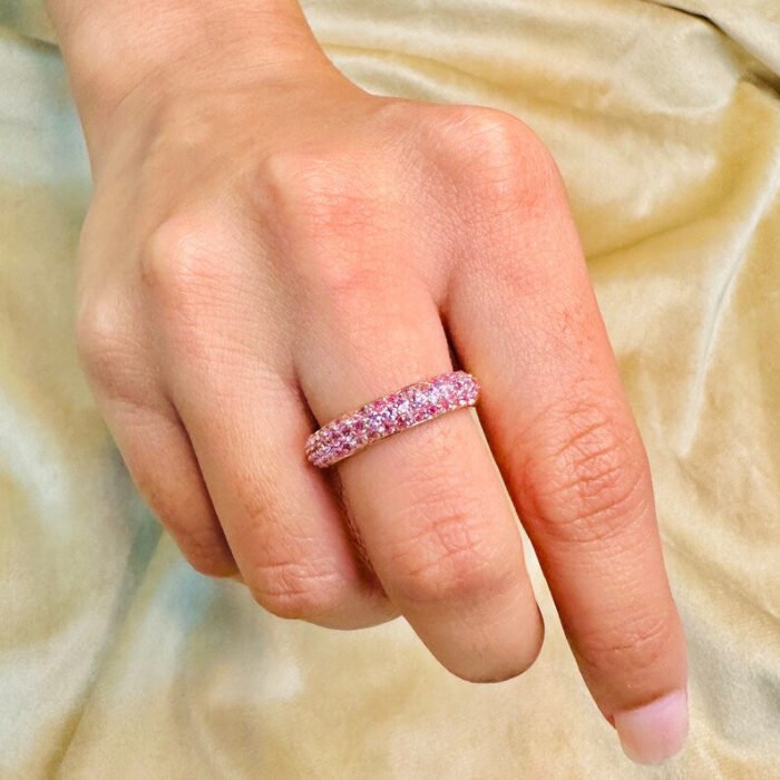 Weighing 4.55 grams, this pink sapphire dome style band offers a luxurious feel, making it ideal for everyday wear or special occasions. The elegant design ensures that the pink sapphires remain the focal points, allowing their beauty to shine through. The sophisticated pave setting provides a secure and stylish way to showcase the gemstones, enhancing the overall appeal of the ring.