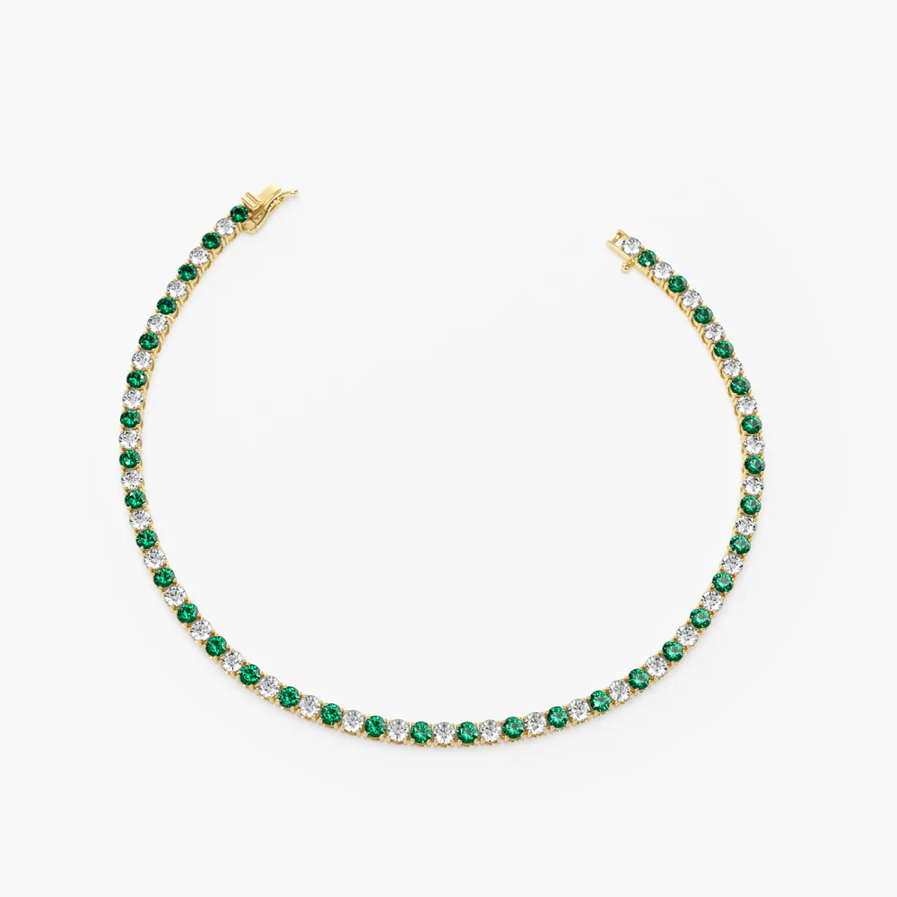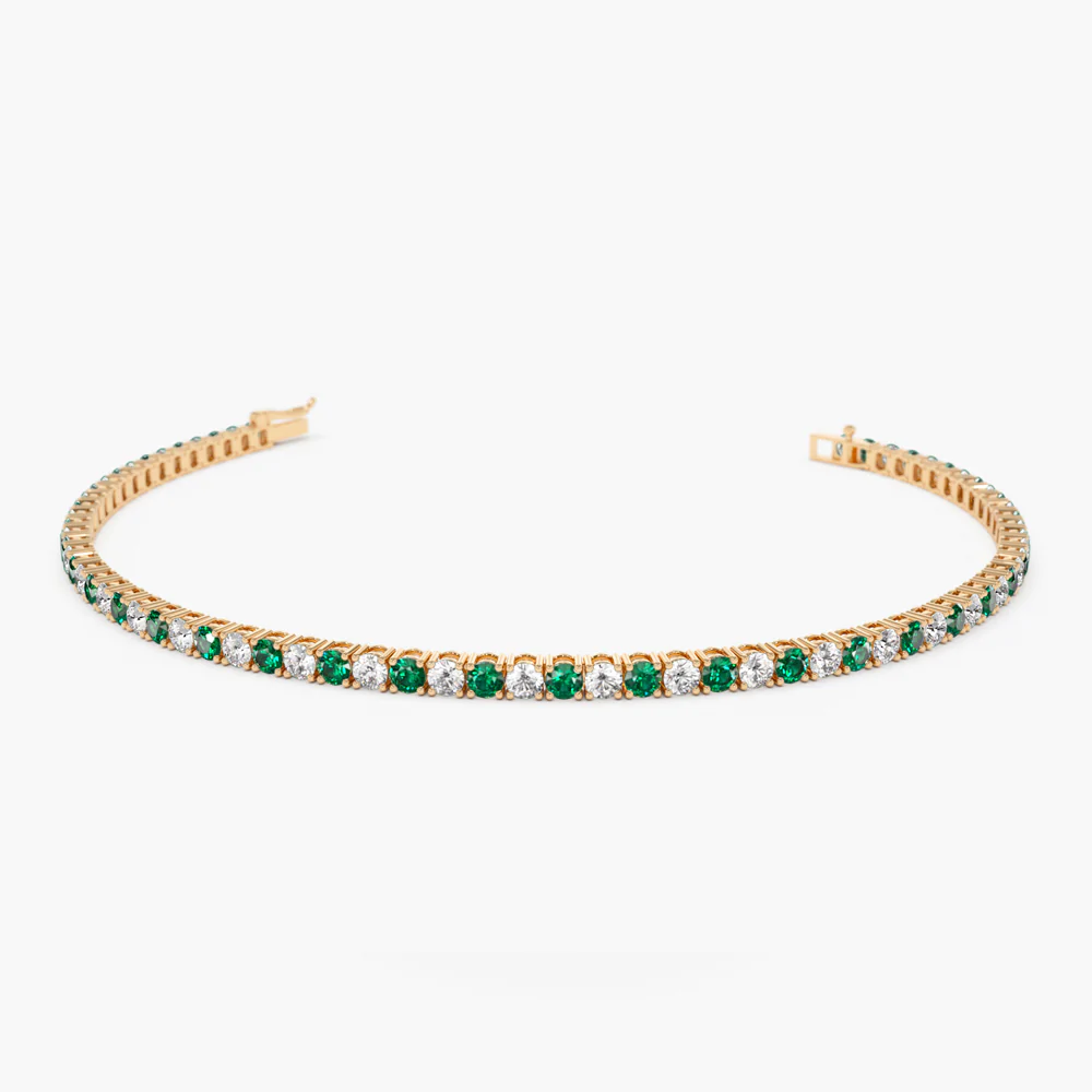 Elegant 14K solid gold tennis bracelet featuring prong-set diamonds and emeralds—crafted for timeless brilliance and refined sophistication.