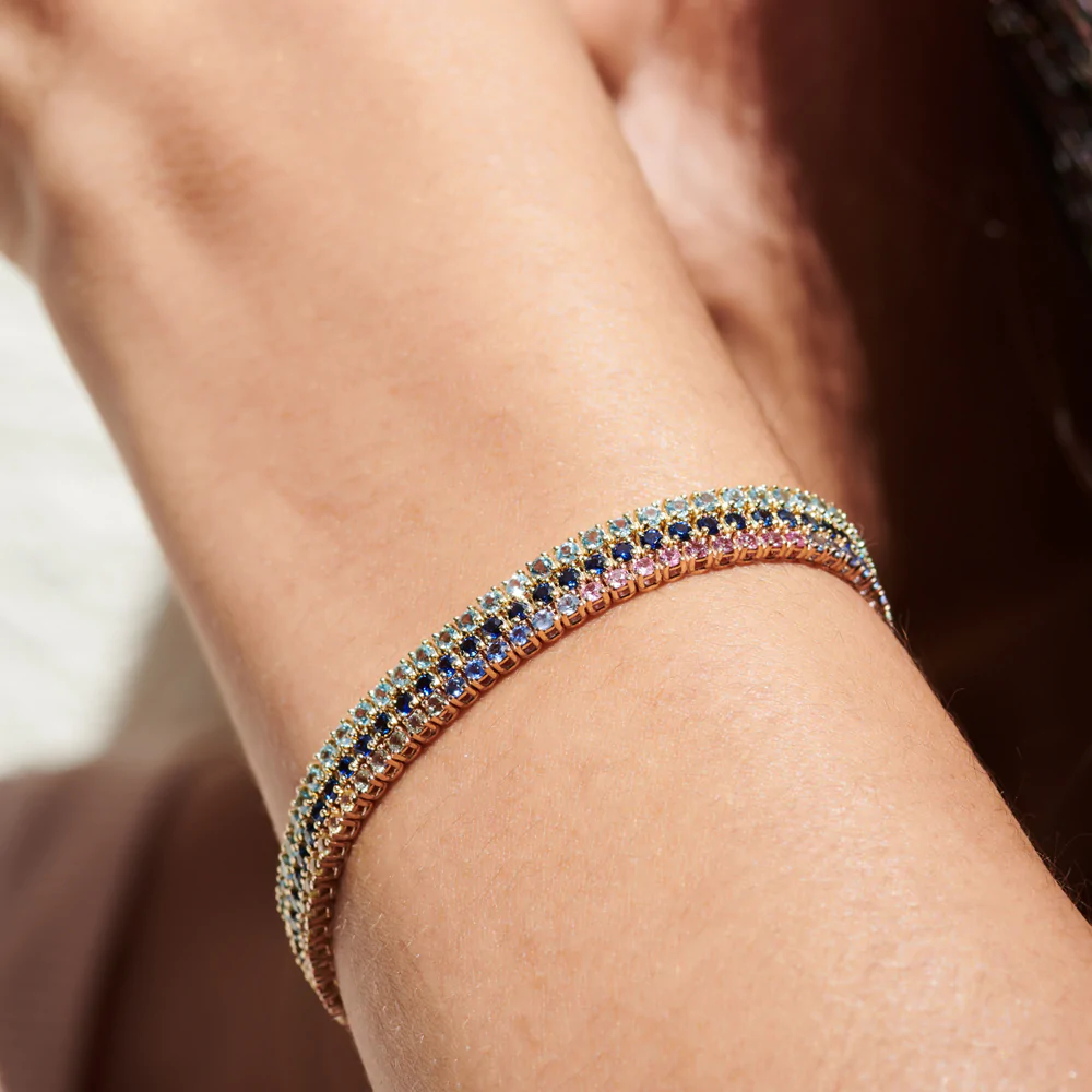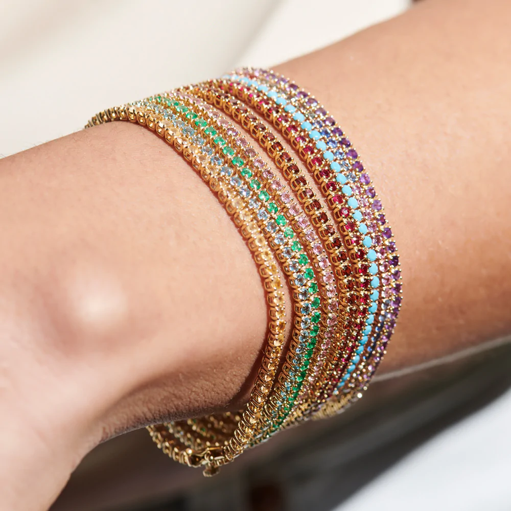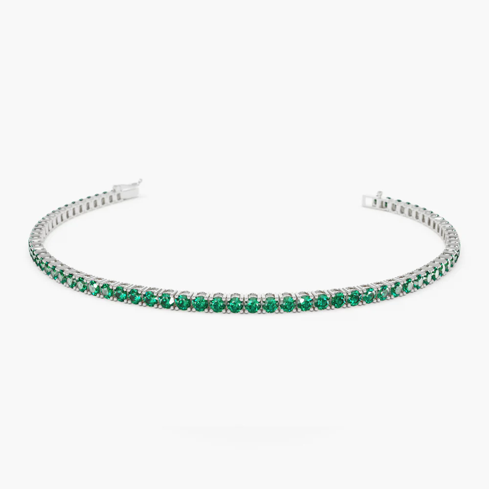 Rich, vibrant emerald gemstones adorn this bracelet. Each is carefully secured in a classic 4-prong setting, which lets the light enhance the natural brilliance of the emeralds, showcasing their deep green hue. The timeless appeal of emeralds makes this bracelet a striking accessory exuding elegance and sophistication.