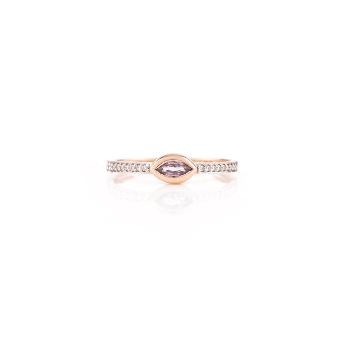 This marquise cut amethyst ring is both bold and elegant. The amethyst is vibrant, and the rose gold setting enhances its beauty.