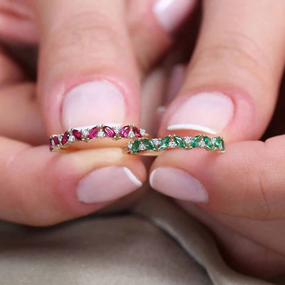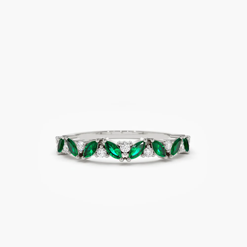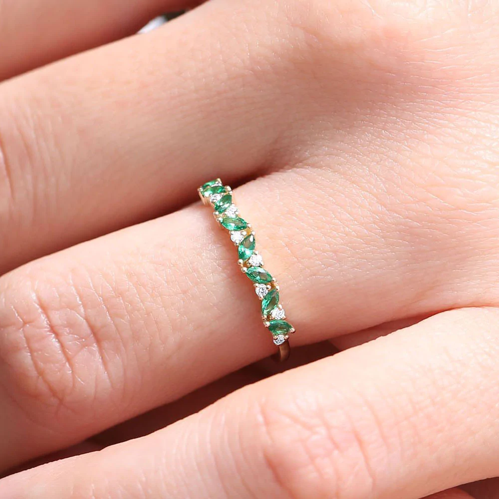 Elegant 14K solid gold diamond and emerald arched ring, featuring a stunning arc of diamonds and vibrant emeralds for a sophisticated and timeless look.