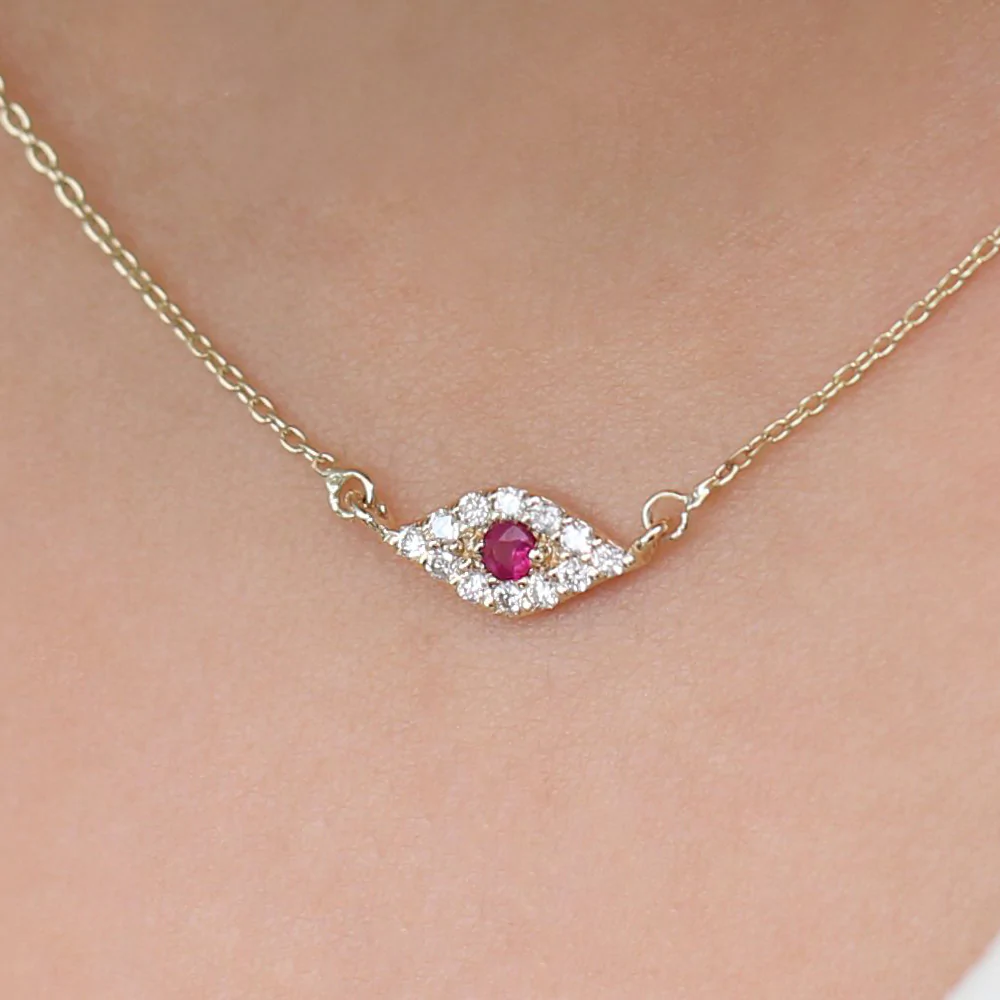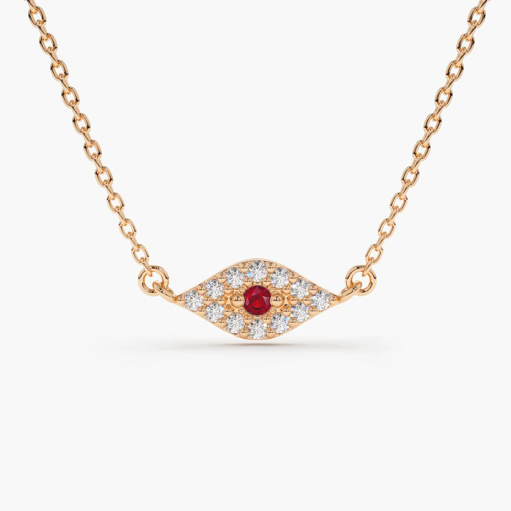 A captivating 14K solid gold necklace featuring a diamond and ruby evil eye pendant, offering both protection and elegance with a modern twist.
