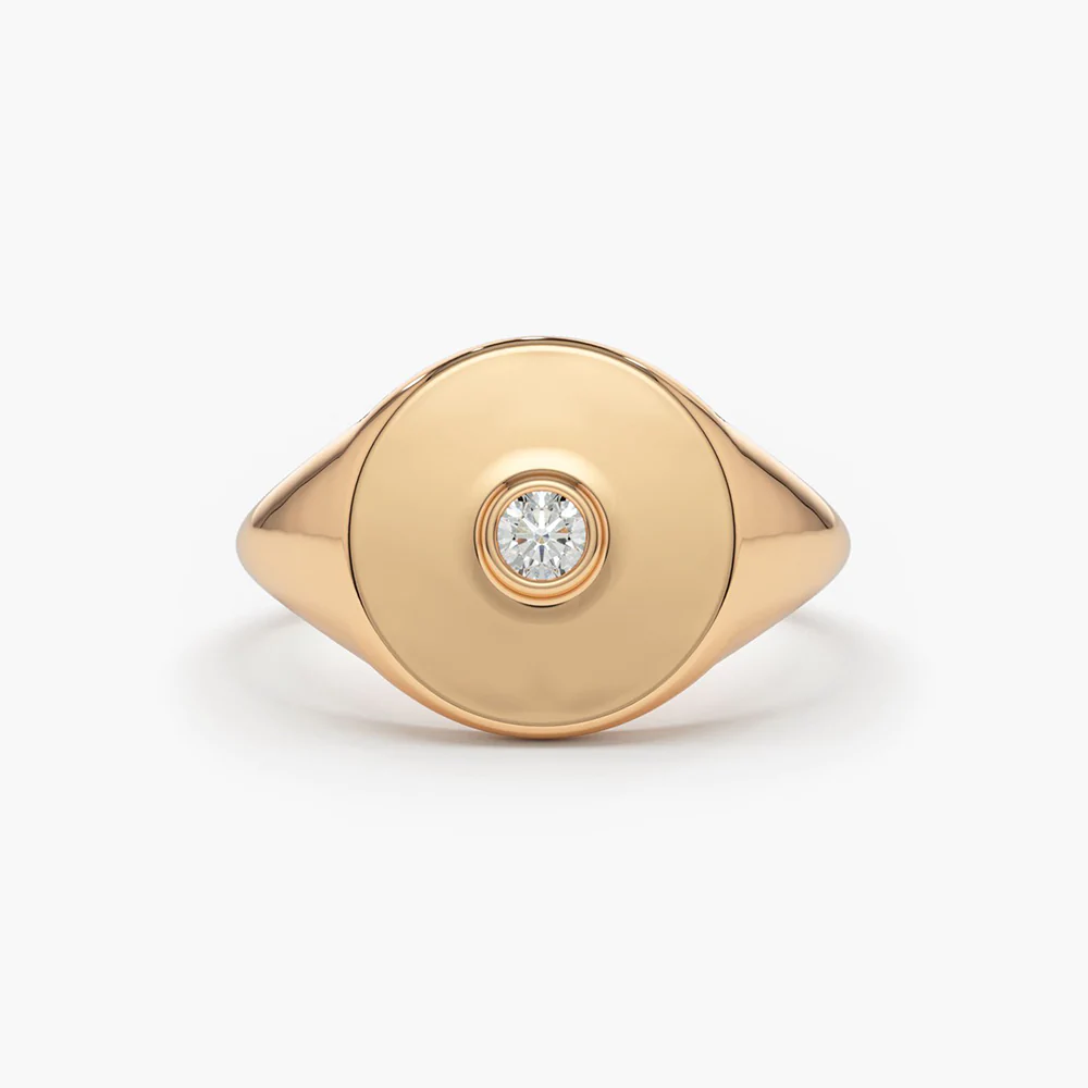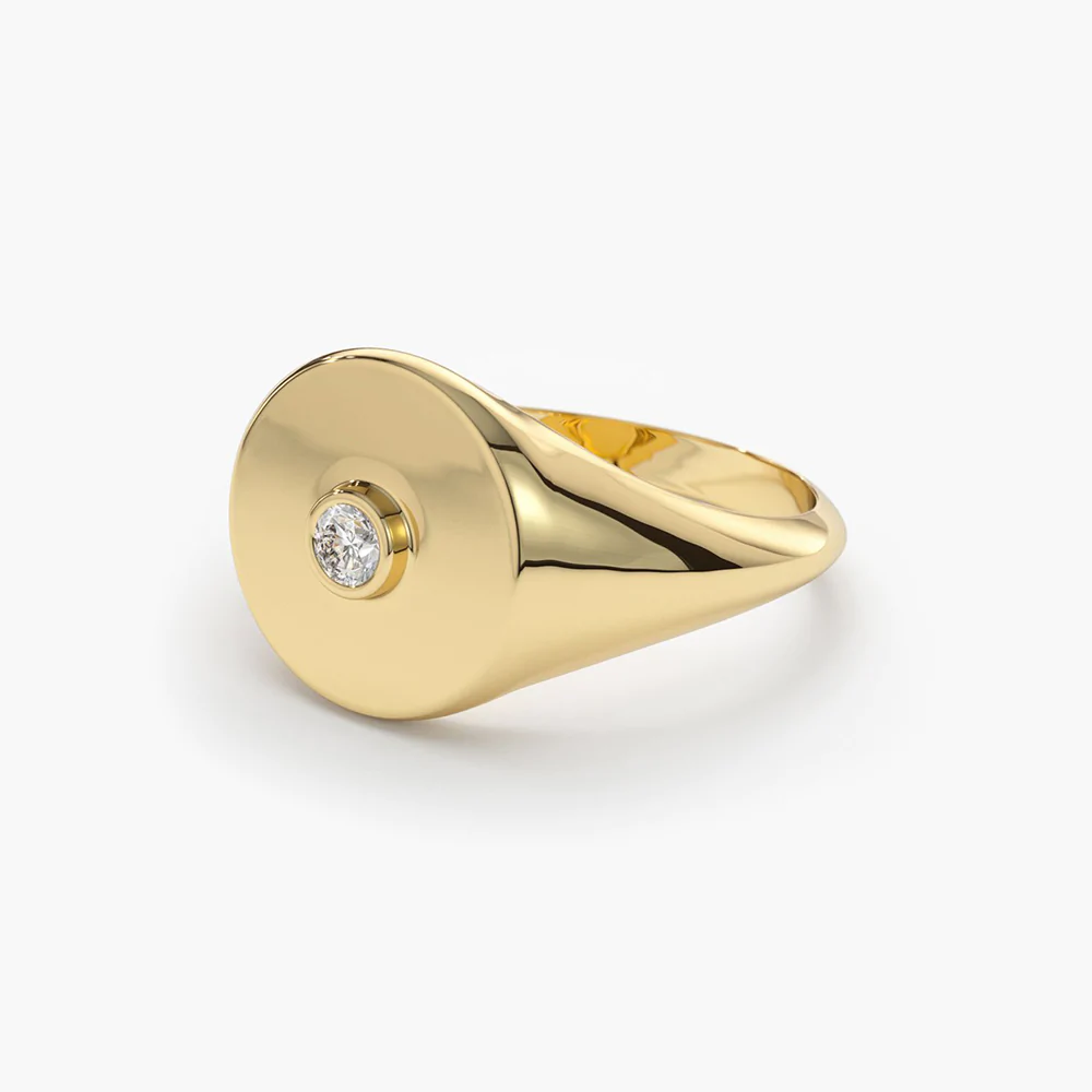 The 14K Gold Diamond Pinky Signet Ring is a stylish statement piece featuring a 2.5 mm round diamond set in a bezel.
