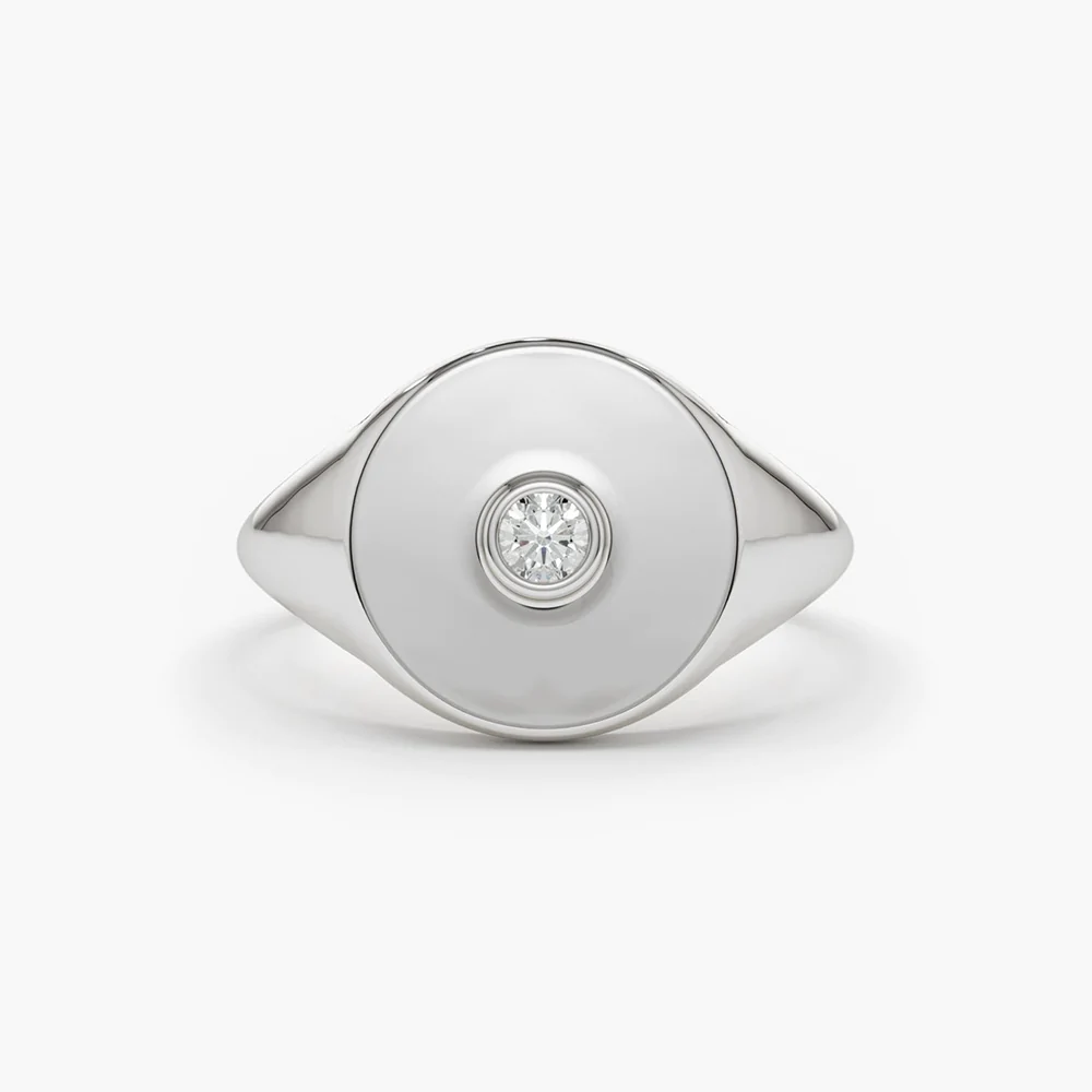 The 14K Solid Gold Diamond Pinky Signet Ring is a classic, classy piece for the minimalist with taste for finer things in life. The round signet design of this luxurious ring comes with a 2.5MM round diamond in sleek bezel setting.