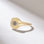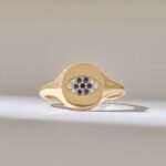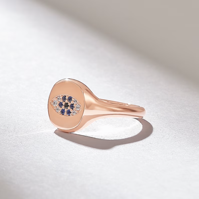 14k gold evil eye signet ring with 0.13 ct natural diamonds and 0.06 ct sapphire. A symbol of protection. BIS & GIA certified.
