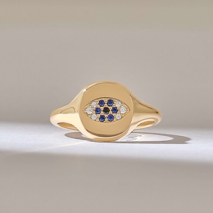 14k Solid Gold Evil Eye Signet Ring All-Seeing Eye Protection with Pave Sapphire