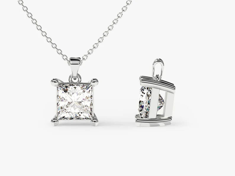 Crafted in 14K Solid Gold, this pendant is available in White Gold, Rose Gold, and Yellow Gold, allowing you to choose the perfect shade to match your style. The princess-cut Moissanite adds a modern and refined touch, making this necklace an ideal choice for daily wear or special occasions.