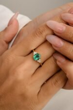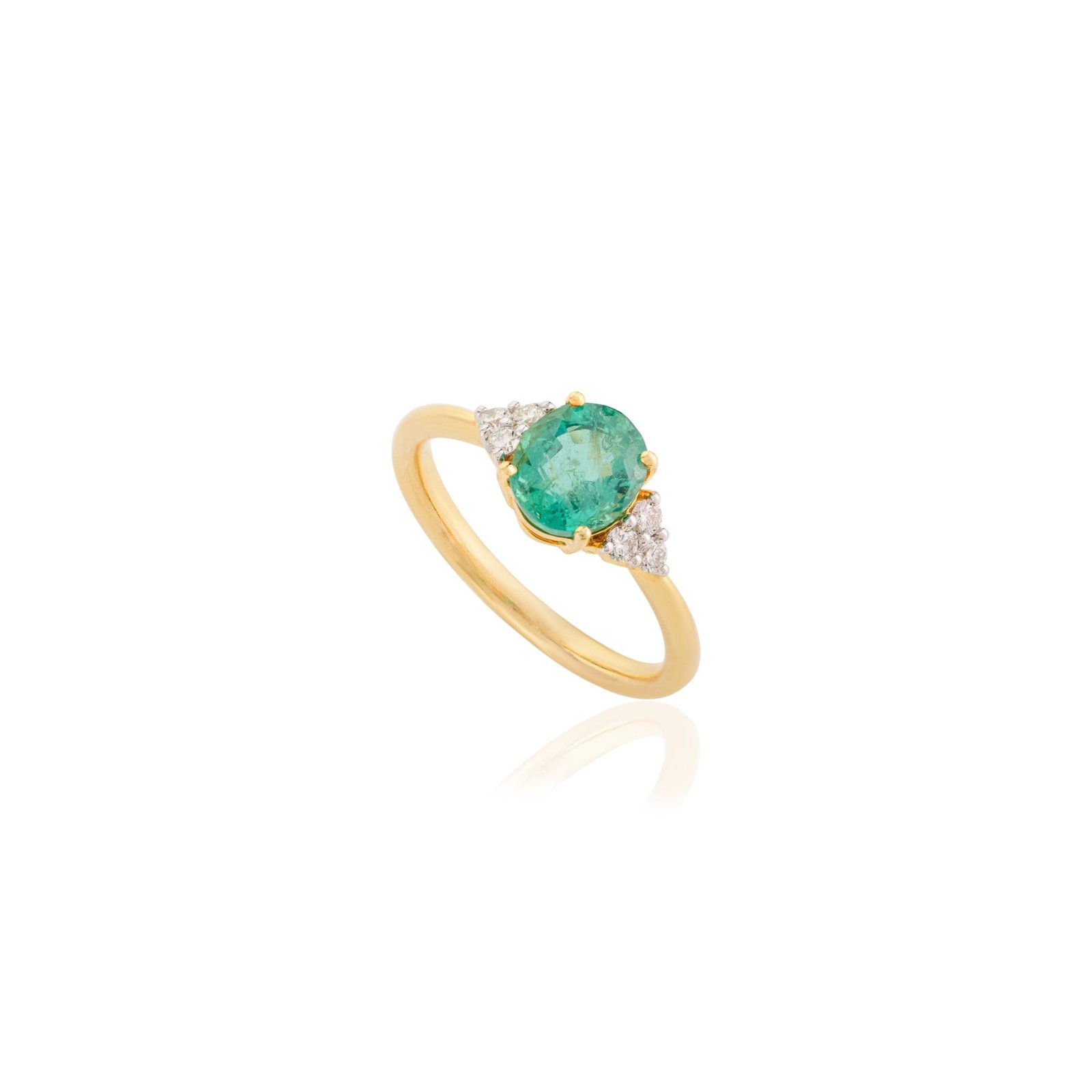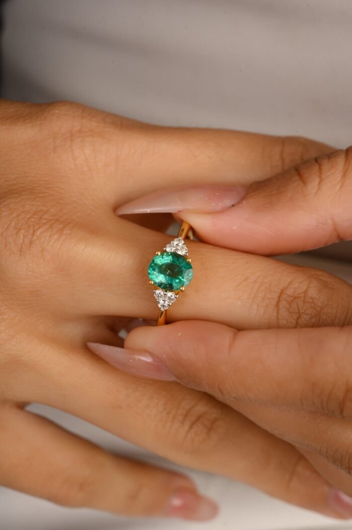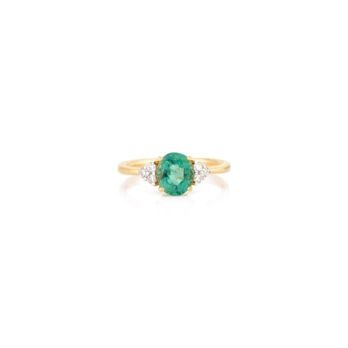 The 14K Solid Gold Emerald Diamond Statement Ring is a captivating piece of jewelry designed to make a bold impression. Crafted from high-quality 14K yellow gold, the ring features a central oval-shaped emerald weighing 1.26 carats. The emerald’s vibrant green hue and classic oval cut enhance its allure and brilliance.
