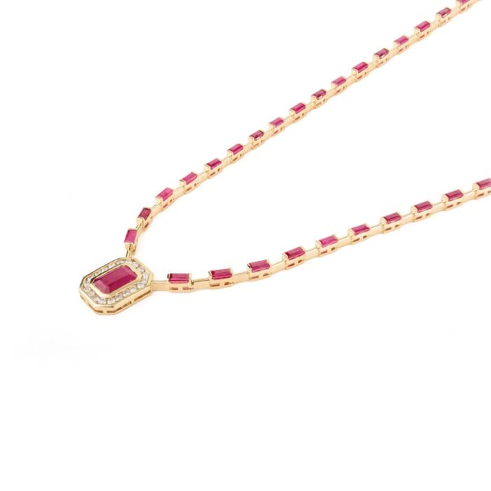 Indulge in the opulent beauty of the 14K Solid Gold Ruby Diamond Necklace, a stunning creation crafted from premium 14K solid gold. This necklace boasts a breathtaking ensemble of 51 rubies, with sizes ranging from 5.5 x 8.2 mm to 4.4 x 2.3 mm, totaling an impressive 9.8 carats. The rubies, renowned for their deep red hues and exceptional clarity, are meticulously set to showcase their natural brilliance and color intensity.