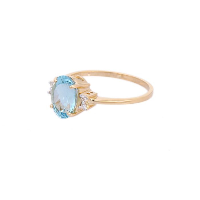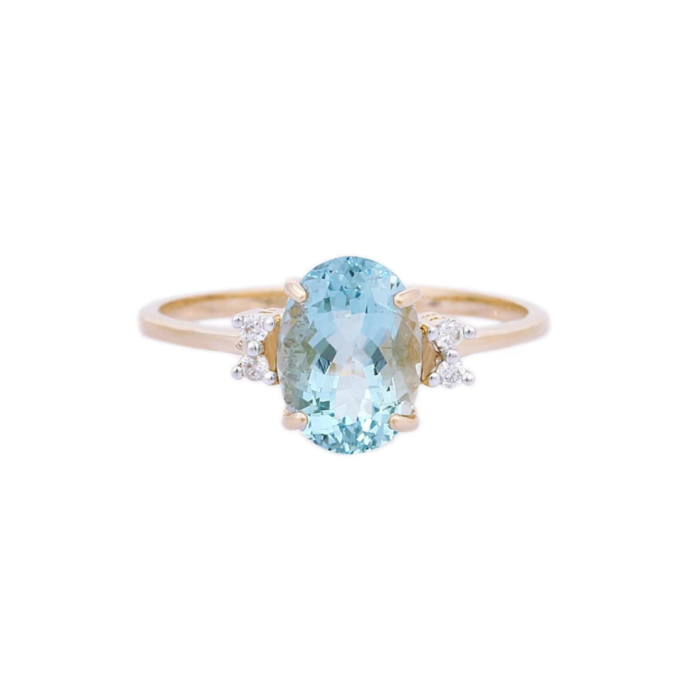 Surrounding the aquamarine are four sparkling diamonds, with a combined weight of 0.06 carats. These diamonds are carefully set to enhance the overall brilliance of the ring, adding a touch of subtle sparkle that complements the serene color of the aquamarine. The diamonds’ delicate shimmer provides a perfect contrast to the gemstone’s tranquil hue.