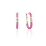 Set within the enamel are brilliant round diamonds, each measuring 0.5 mm and collectively weighing 0.21 carats. The diamonds are expertly prong-set, ensuring that they are securely fastened while maximizing their sparkle and brilliance. The prong setting allows light to enter the diamonds from multiple angles, creating a dazzling effect that adds a touch of glamour to these understated hoops.