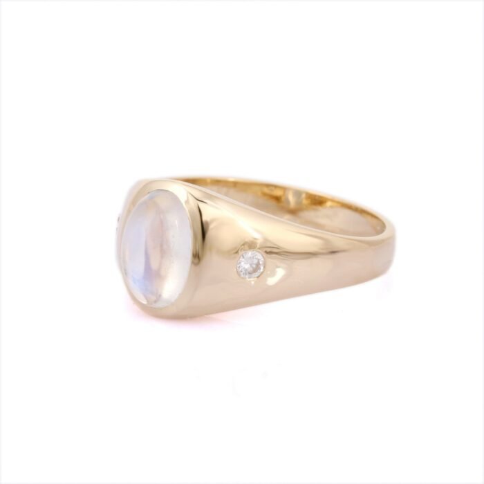 At the center of this ring is a magnificent 4.975 ct oval rainbow gemstone, measuring 9 x 6 mm. This captivating stone displays a mesmerizing array of colors, catching the light beautifully and adding a dynamic, colorful touch to the piece. The rainbow gemstone is a symbol of hope and renewal, making this ring not only a stunning accessory but also a meaningful one.
