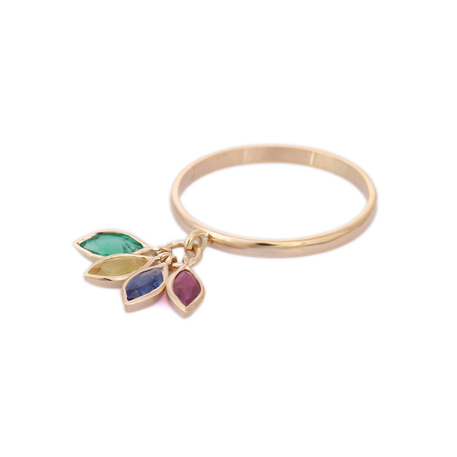 Introducing the 14K Solid Gold Ruby, Sapphire & Emerald Ring, a captivating piece that blends vibrant colors with elegant design. The ring features four marquise-shaped gemstones, with a total weight of 0.96 carats. These gemstones include rubies, sapphires, and emeralds, each contributing their unique hue to the stunning arrangement.