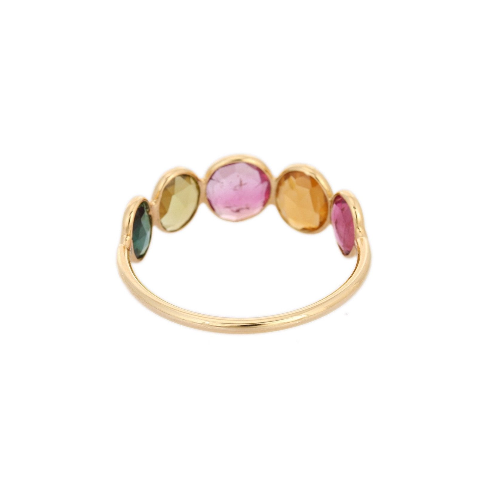 Discover the vibrant charm of our 14K Solid Gold Tourmaline Ring, a striking piece that combines the luxurious warmth of gold with the rich hues of tourmaline. Crafted from high-quality 14K yellow gold, this elegant ring features five oval-shaped tourmaline gemstones, each contributing to the ring’s overall weight of 2 carats. The tourmalines exhibit a captivating spectrum of colors, ranging from deep greens to warm pinks, creating a dazzling array that catches the eye from every angle.