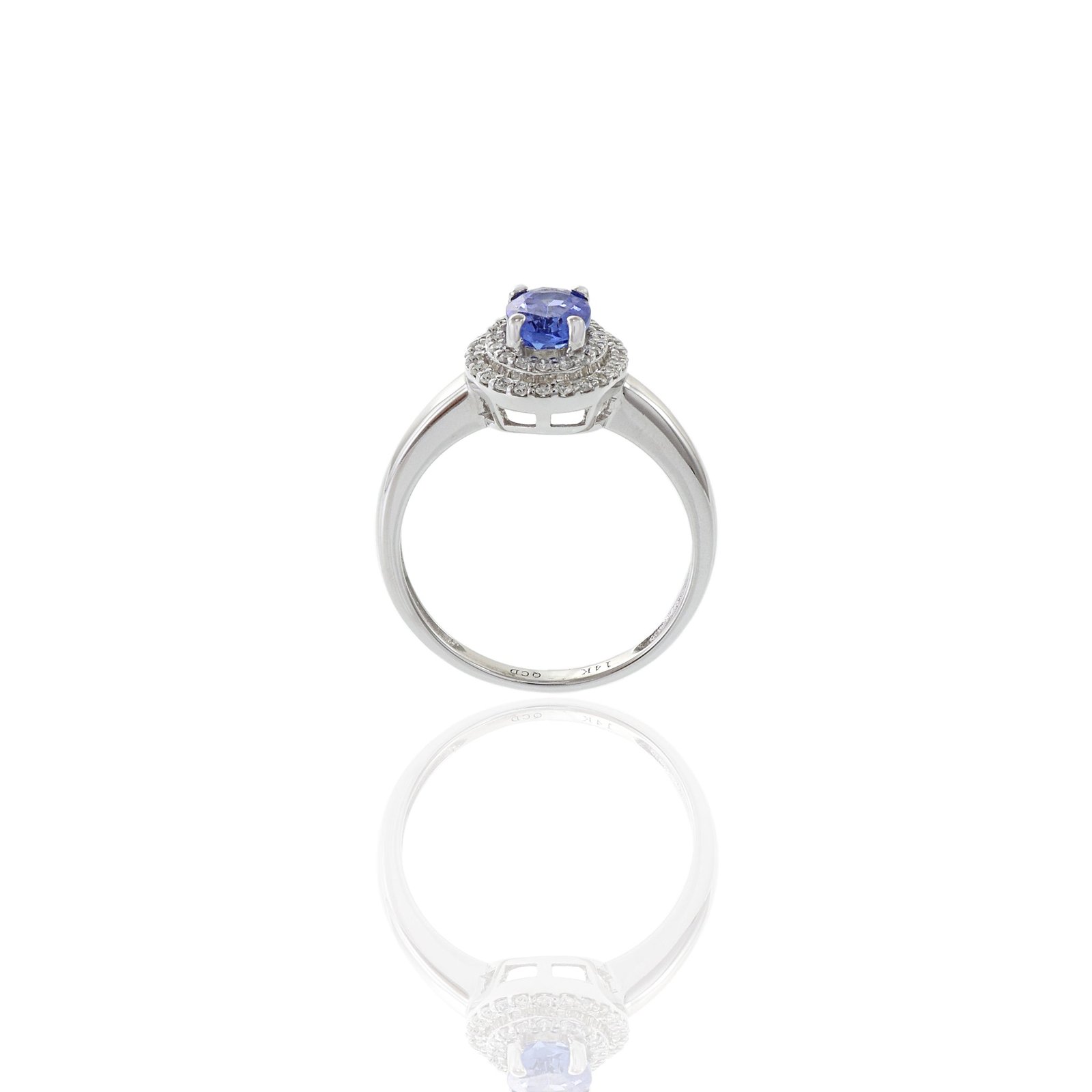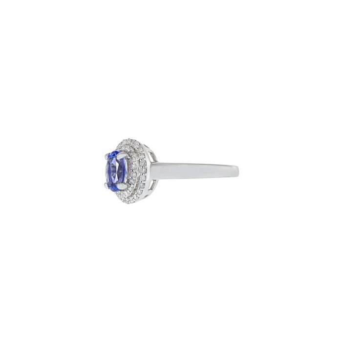 At the center of this ring stands a captivating 0.78-carat oval-cut tanzanite, known to be an excellent source of bright colors and outstanding brilliance. With a double halo of round-cut diamonds, totaling.28 carats with a color grade of H and an SI1-SI2 grade of clarity, the elegant tanzanite becomes the epitome of classic and sophisticated design.