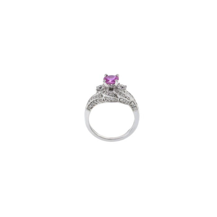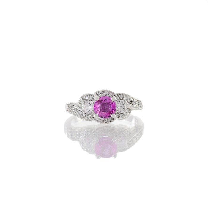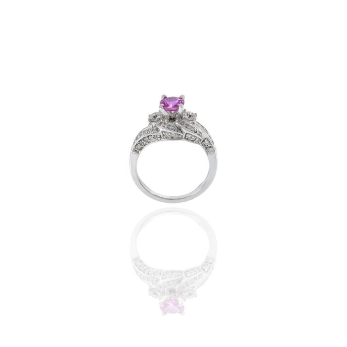 The standout feature of this ring is its enchanting pink sapphire beautifully complemented by a swirl of sparkling diamonds. Its unique swirl design adds a modern twist to classic elegance, making it perfect for both everyday wear and special occasions.
