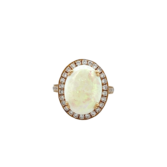 Stunning 14K solid gold round-cut diamond and opal ring, featuring a radiant opal center stone surrounded by sparkling diamonds for a luxurious and elegant look.