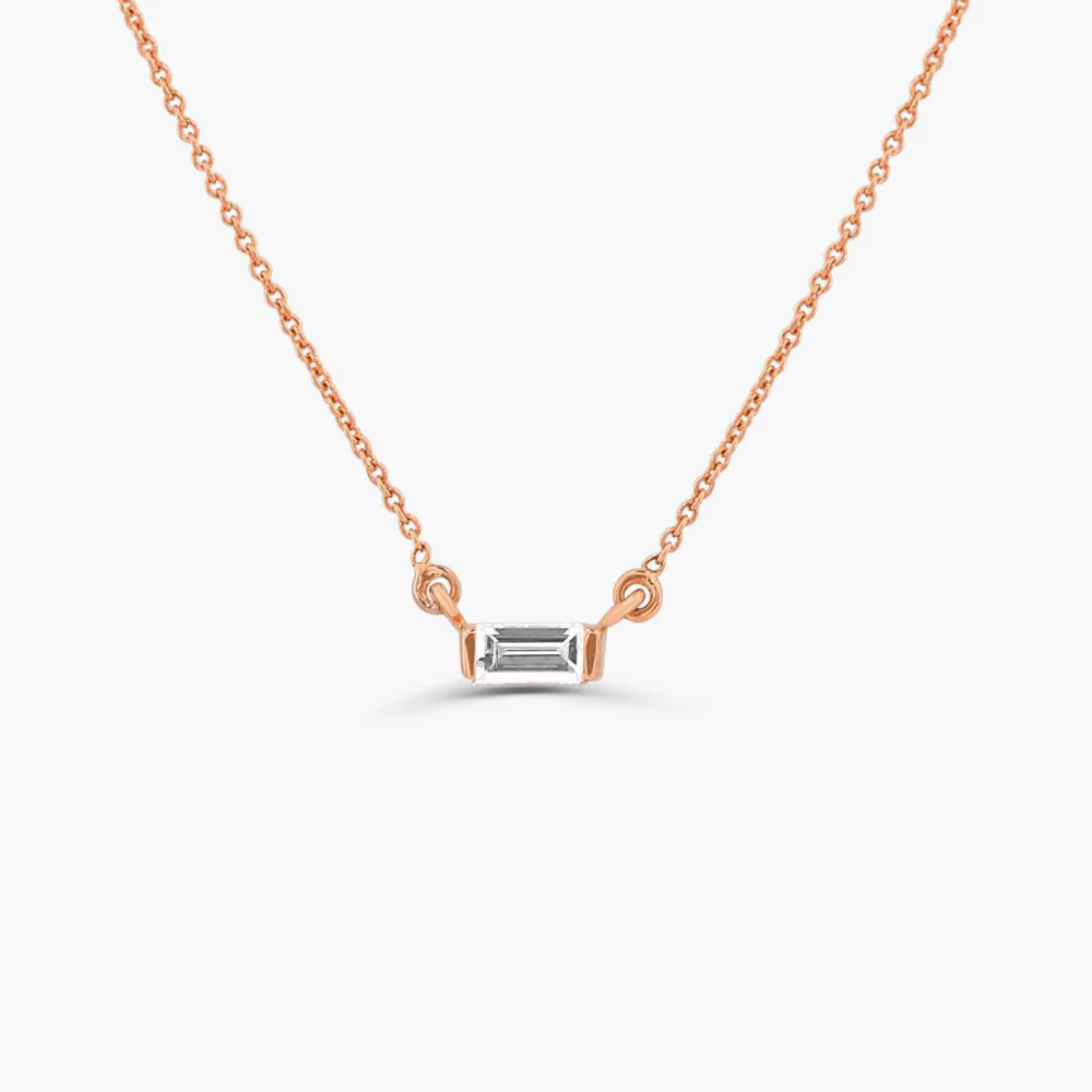 In white, rose, or yellow gold, this beautiful baguette diamond necklace is set in solid 18k gold, giving you ample options for your preferred finish to your style.
