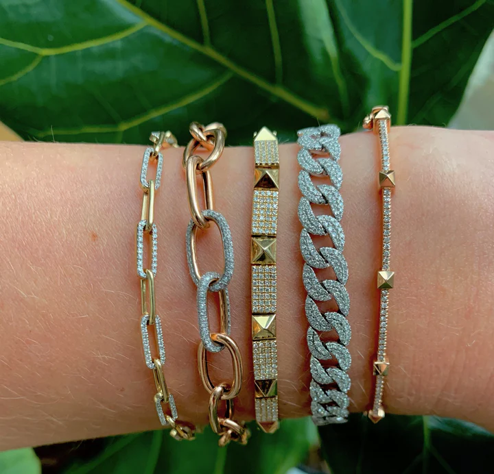 Bold yet sophisticated, the 18k Gold Pyramid Diamond Stud Bangle is a modern statement piece that exudes strength and elegance. Crafted from premium 18k gold, this sleek bangle features a pyramid-inspired design with carefully placed diamond accents, adding just the right amount of brilliance and luxury. The geometric detailing gives it a contemporary edge, making it perfect for those who appreciate bold and refined jewelry.