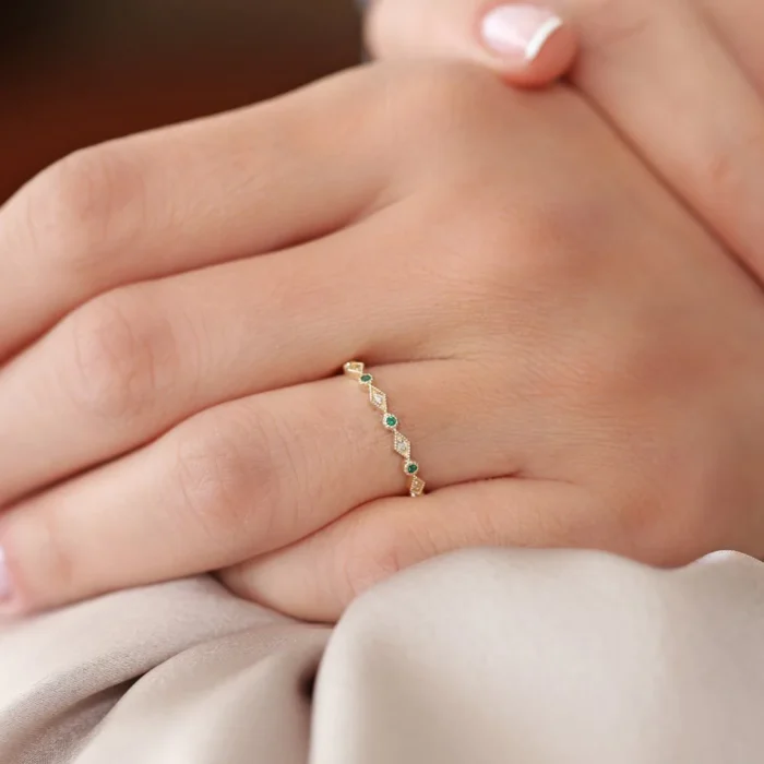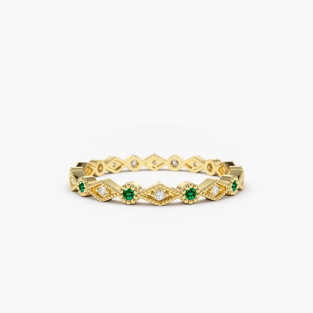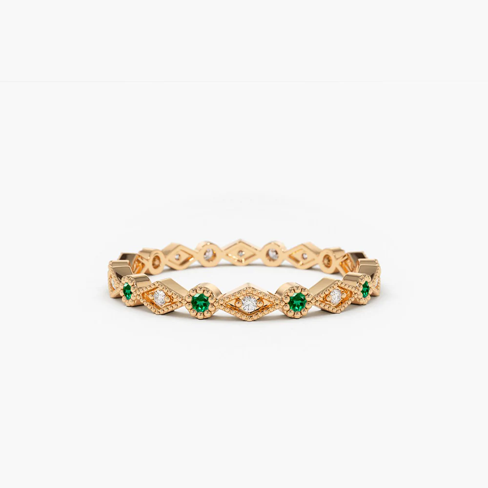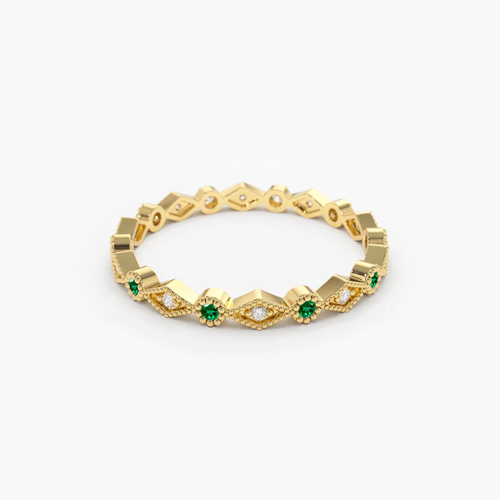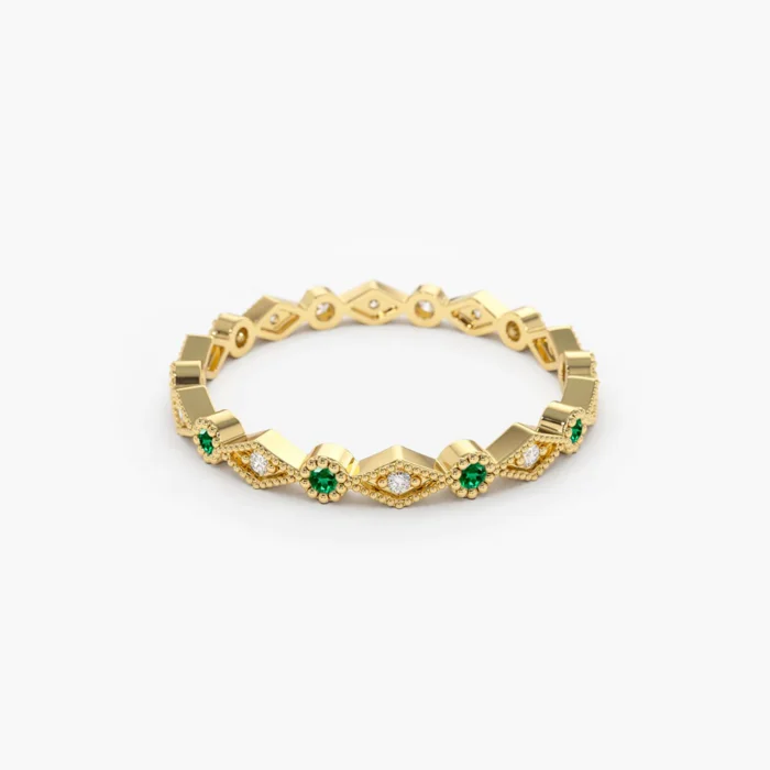 A stunning 14K solid gold eternity band featuring alternating emeralds and diamonds, offering a timeless and elegant design symbolizing eternal love.
