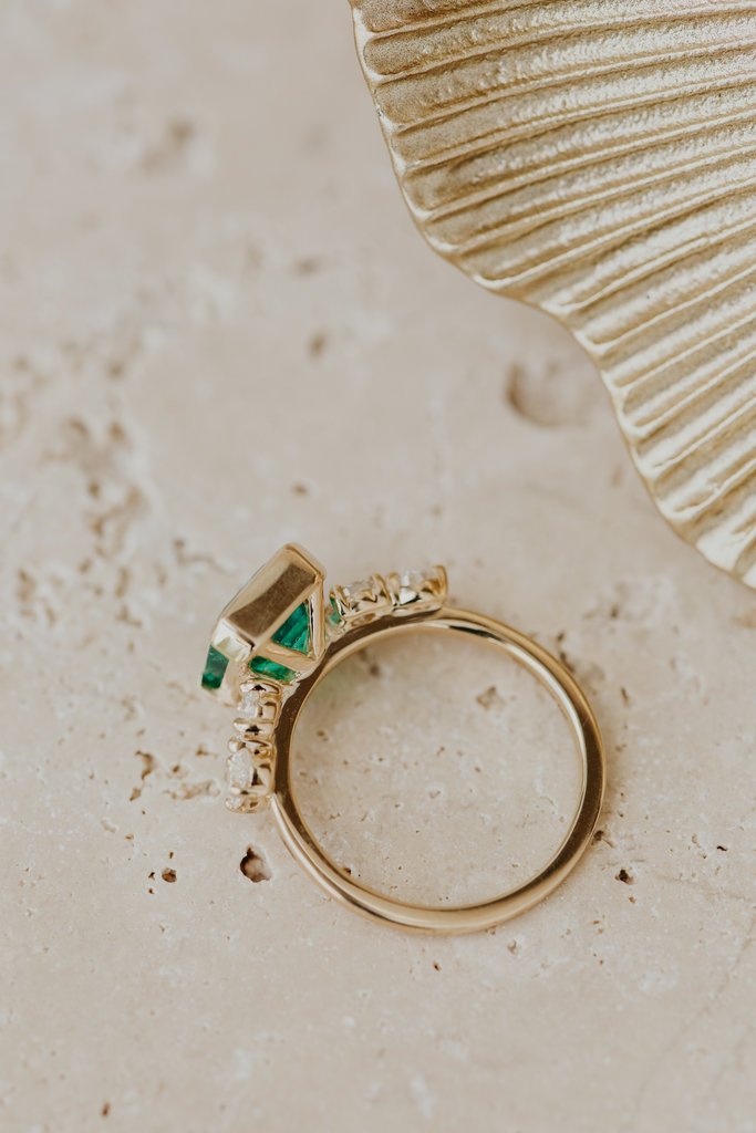 Stunning 14K solid gold diamond and octagon cut emerald ring, featuring a bold octagon-shaped emerald center stone accented with sparkling diamonds for a sophisticated look.