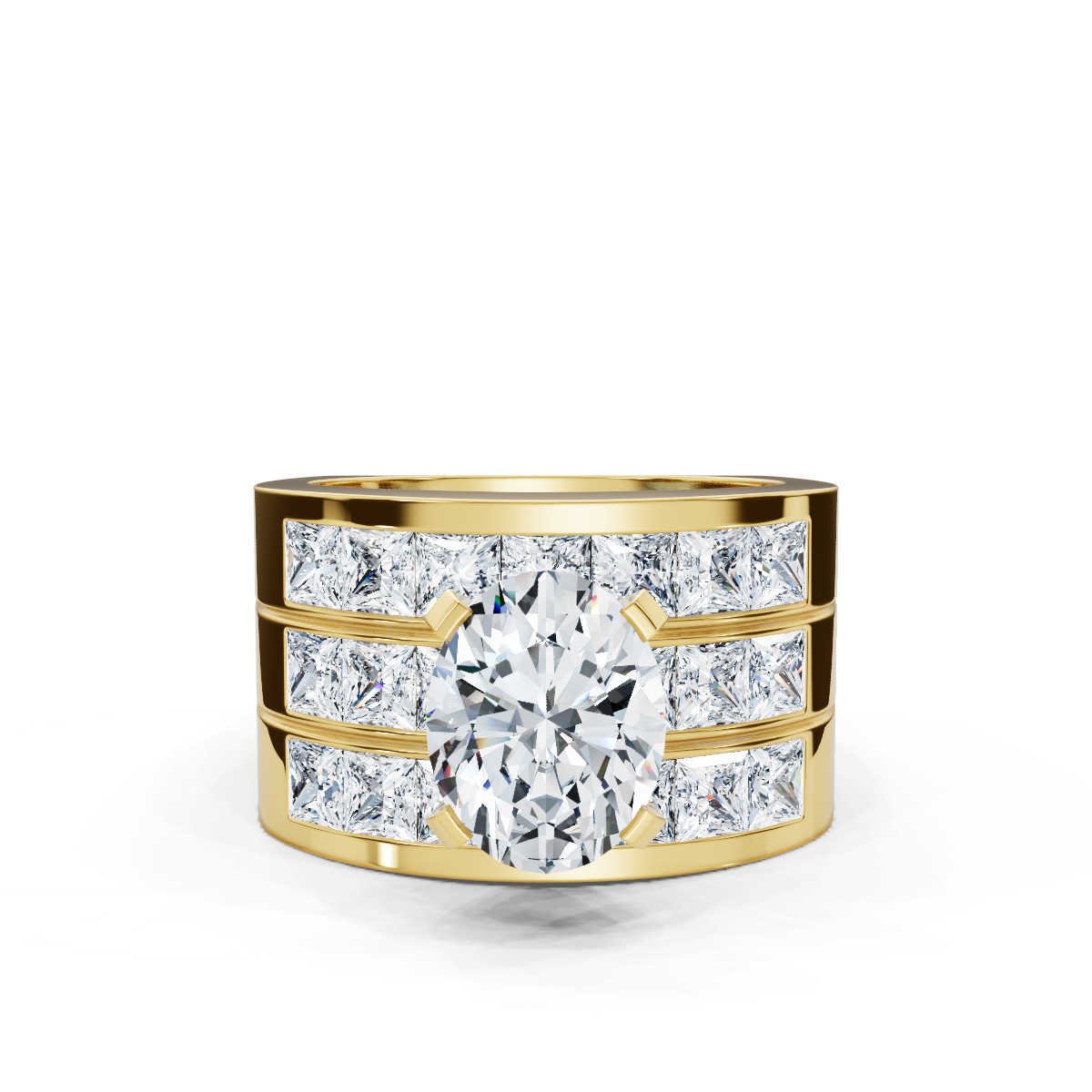 Luxurious 18k gold Moissanite solitaire ring featuring a 2ct oval-cut center stone and 2.4ct princess-cut side diamonds set in a bold 9mm comfort-fit band.