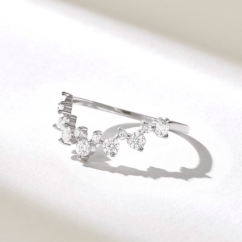 This graceful ring features 0.41 carats of natural diamonds in GH COLOR, VS-SI clarity, arranged in a curved silhouette with alternating round stones that create a balanced and eye-catching rhythm of brilliance. With a slender 1.11 mm band width and 0.96 mm thickness, it offers a lightweight yet luxurious feel, ideal for everyday stacking or as a minimalistic wedding band.