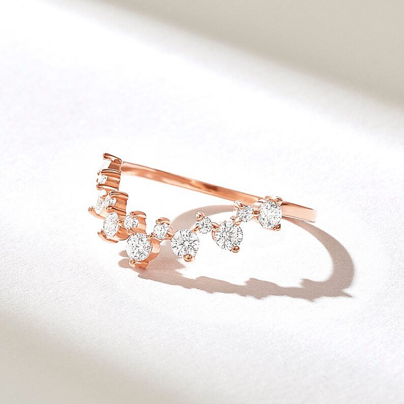 18K Solid Gold Alternating Round Natural Diamond Curve Ring | Stackable Dainty Wishbone