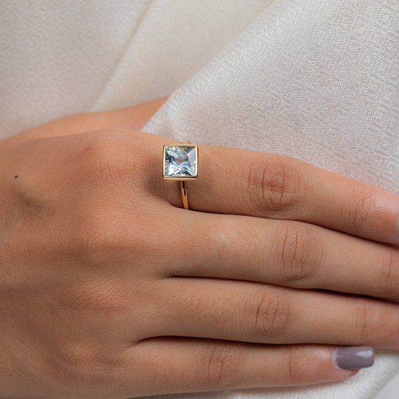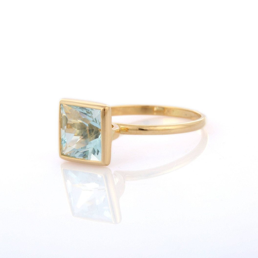 A beautiful 18k solid gold ring featuring a stunning aquamarine, offering a serene and timeless design perfect for any occasion.