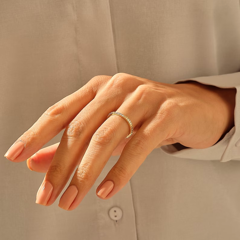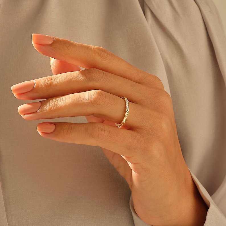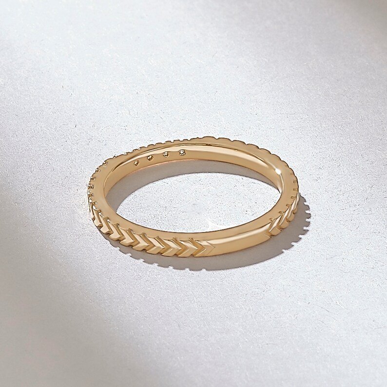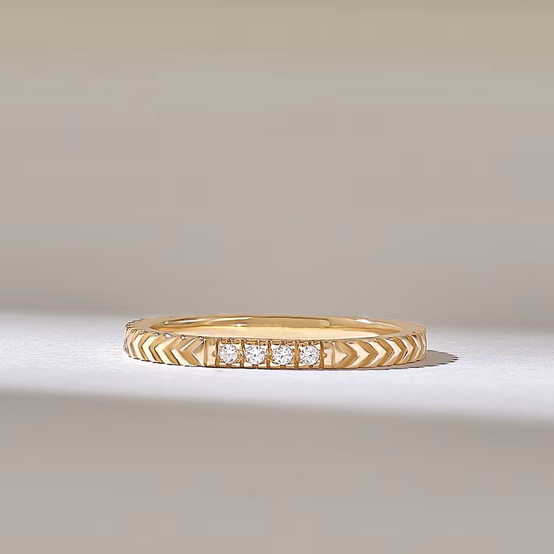 18K Solid Gold Arrow Pattern Engraved Natural Diamonds Wedding Ring