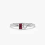 At its center, a 2.00mm round moissanite diamond is used along with D color and VVS1 clarity to really make it sparkle. And then, to add deep red color, a beautiful 3×1.5mm baguette ruby is used. Here, the total diamond weighs 0.03 carats and the ruby weighs in at 0.10 carats, giving it a tasteful and very eye-catching design.