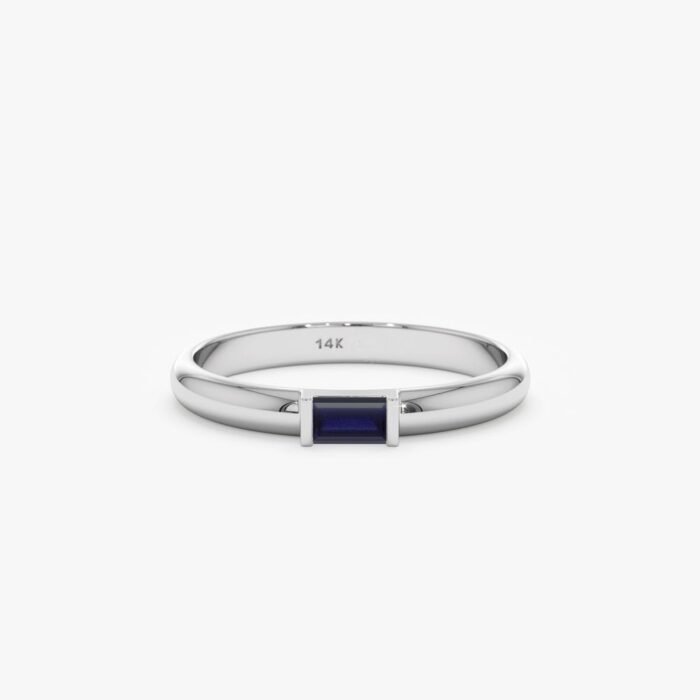 At the heart of this ring lies a captivating baguette sapphire, the birthstone for September, set in a dome band. The sapphire’s deep blue hue symbolizes wisdom, truth, and sincerity, making it an ideal choice for celebrating birthdays or special occasions, or simply adding a touch of sophistication to your everyday attire.
