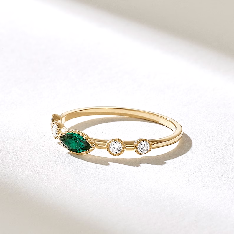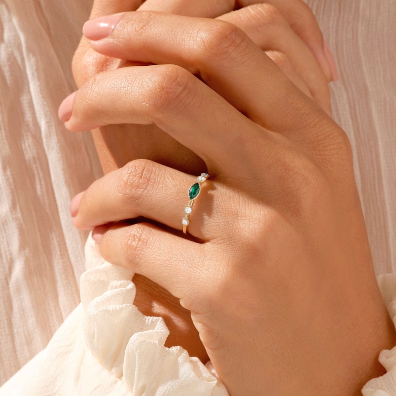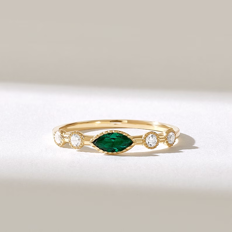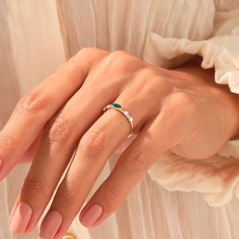 Discover the spellbinding 18k Solid Gold Bezel Green Gemstone Ring , featuring a gorgeous marquise-cut emerald in 18k solid gold. This beautiful ring comes in white, rose, and yellow gold, giving you the opportunity to select the color that best suits your personality. The natural emerald weighs 0.18 carats and is beautifully framed by 0.12 carats of sparkling diamonds.