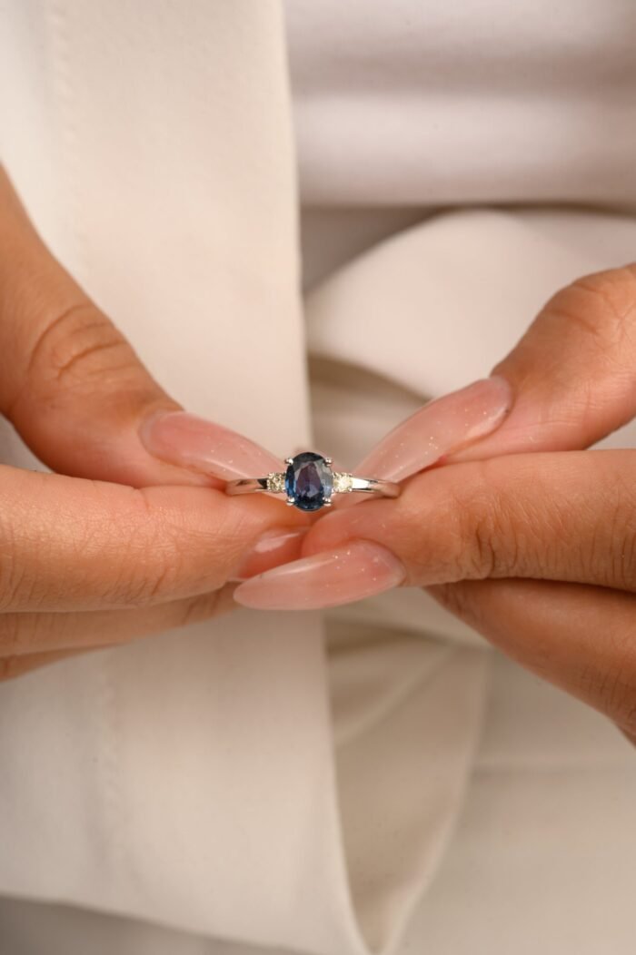 The 18k Solid White Gold Blue Sapphire Statement Ring is a testament to fine craftsmanship and refined taste. Its classic design and high-quality materials make it an heirloom piece that can be cherished for generations. Elevate your jewelry collection with this stunning ring, a perfect blend of elegance and sophistication that will make a lasting impression.