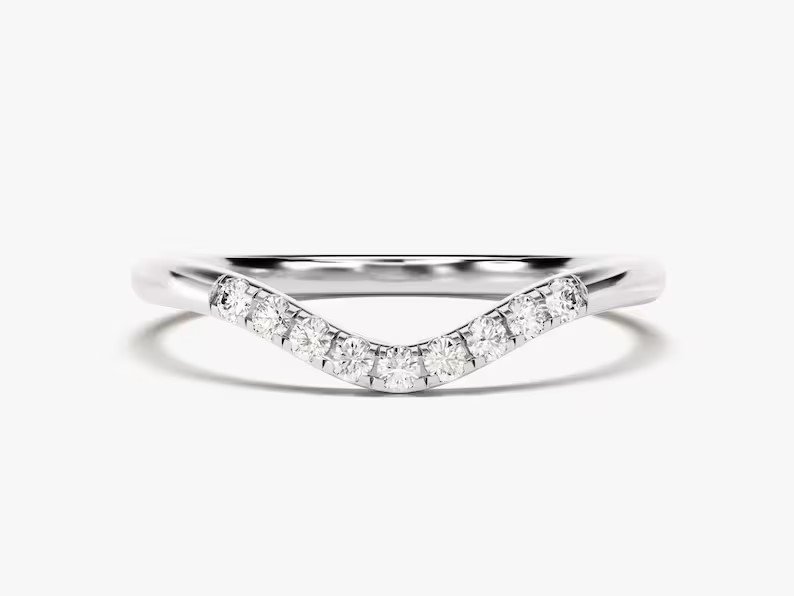 The ring showcases 9 round diamonds totaling 0.24 carats, each carefully selected for their superior GH COLOR and VS-SI Clarity, delivering remarkable sparkle and brilliance. The unique curved design ensures a comfortable fit and pairs beautifully with engagement rings, adding a harmonious and feminine touch to your look.