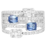 This beautiful piece of jewelry shows both timeless beauty and modern style. The shimmering diamonds, which stand for purity and strength, are just perfectly complemented by the deep blue hues of sapphires, symbolizing wisdom and loyalty.