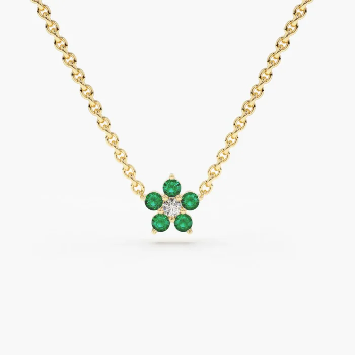 Charming 18k solid gold necklace featuring an emerald and diamond flower charm—crafted for delicate elegance and timeless floral beauty.