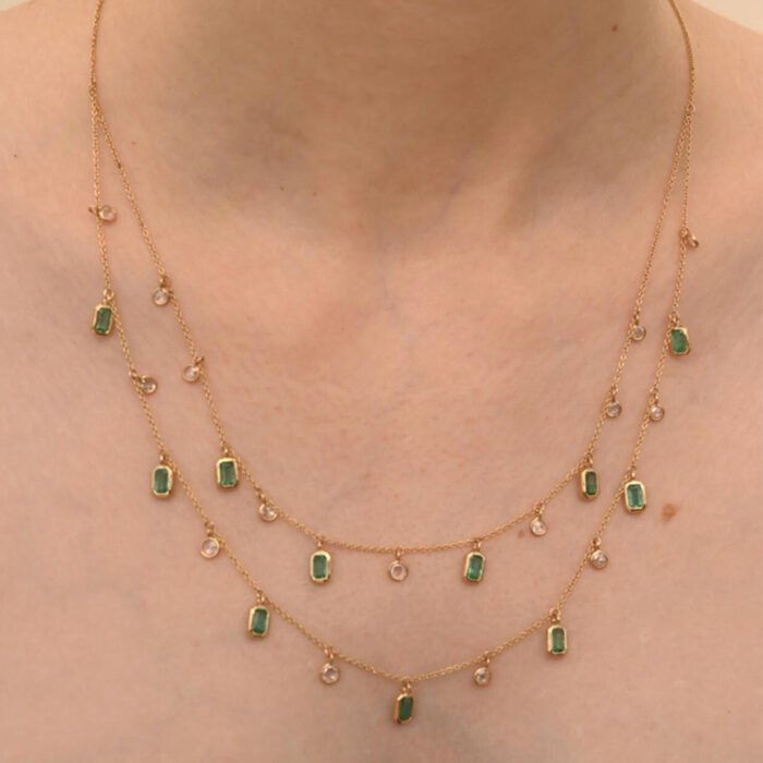 Graceful 18k solid gold necklace featuring emerald and diamond station charms—crafted for delicate elegance, rich sparkle, and timeless charm.