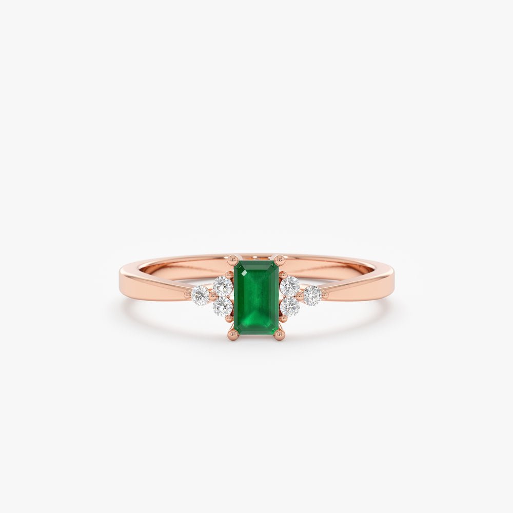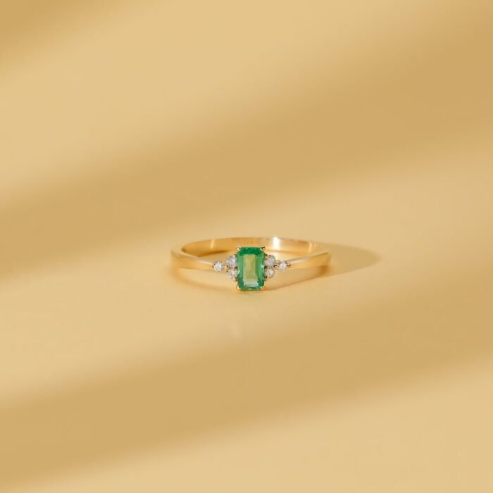 A delicate 14K solid gold ring featuring a petite emerald center stone, accented with sparkling diamonds, offering an elegant and timeless design.