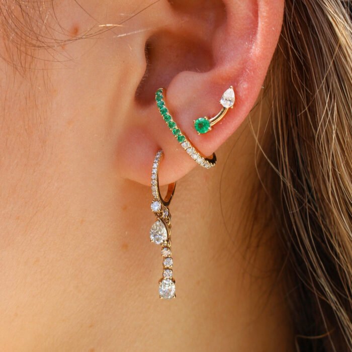 Elegant 18k solid gold curve earring featuring emeralds and pear-shaped lab-grown diamonds—crafted for graceful brilliance and modern style.