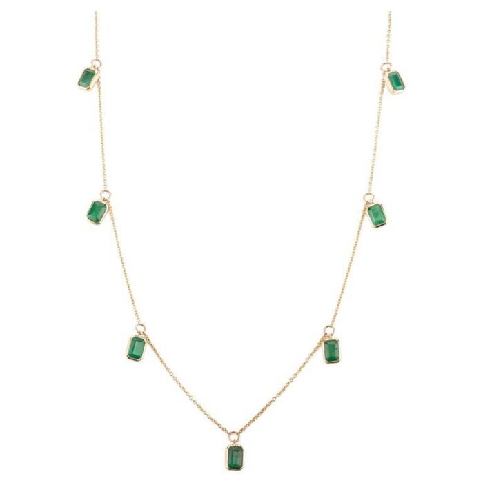 Crafted from 18k solid gold, this necklace features seven vibrant emeralds, with a total gemstone weight of 4.06 carats. Each emerald measures 7 x 5 mm, showcasing their brilliant green hue and expert cut. The emerald charms are evenly spaced along the 17.5-inch chain, creating a balanced and harmonious look.